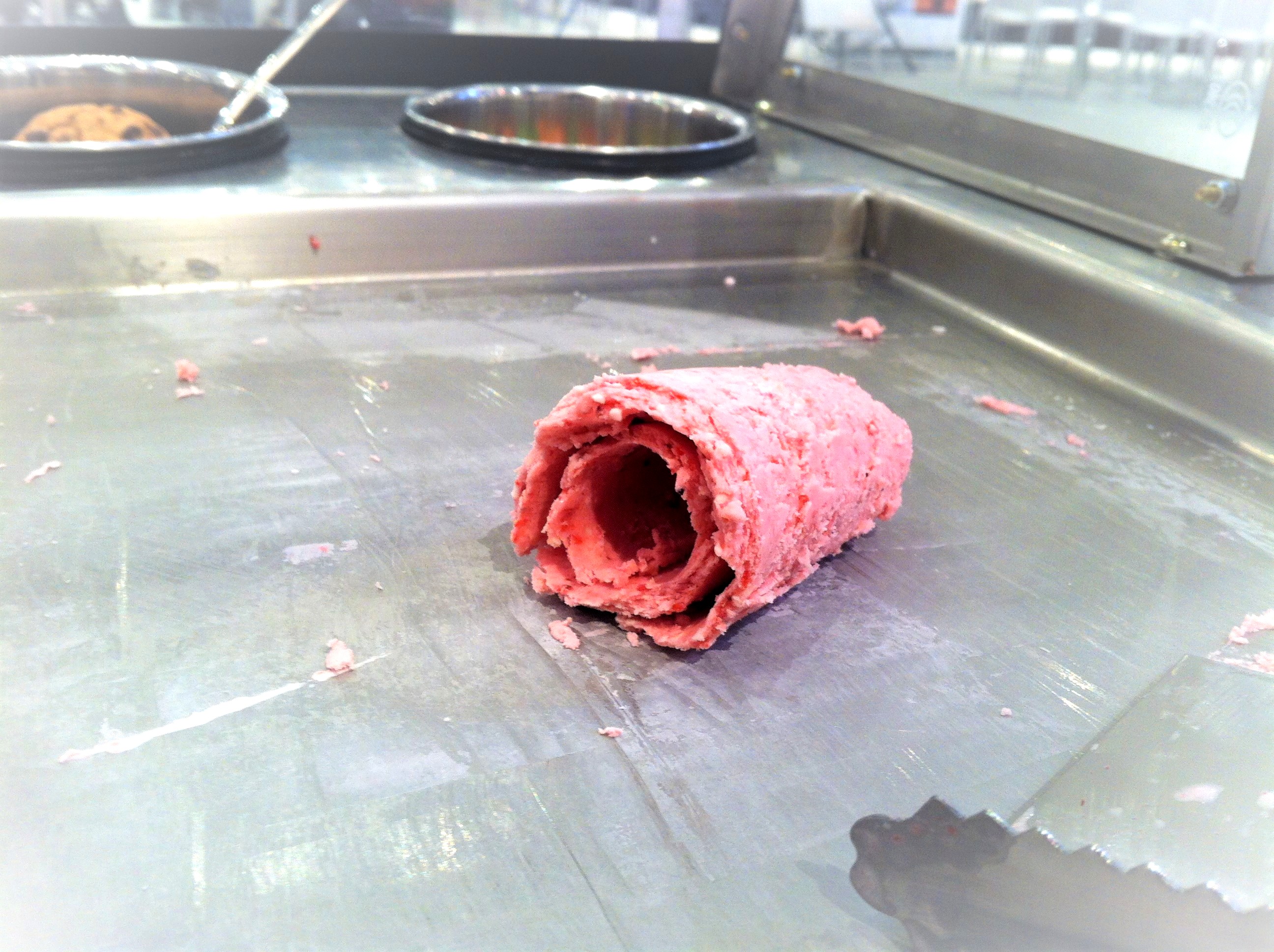 Auf einer Kühlplatte wird die flüssige Eismasse, mit individuellen Zutaten Ihrer Wahl: Früchten, Schokoladenriegeln, Keksen, sogar Gewürzen vermengt und klein gehackt, anschließend glattgestrichen, zu kleinen Eis Cream Rollen aufgerollt und mit Toppings gekrönt.